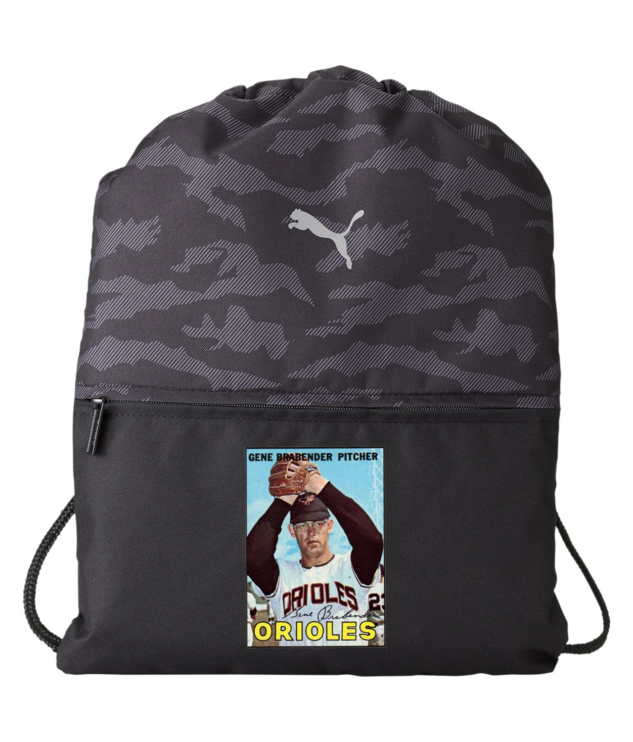 1965 Baltimore Orioles Gene Brabender Pitcher Photo Baseball Logo Symbol Emblem Customized Design on Camo Drawstring Backpack Bag