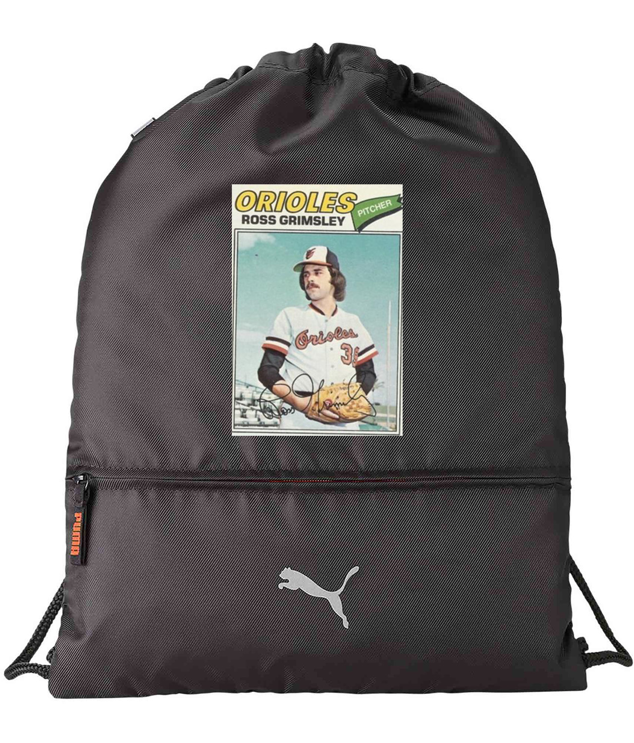 1977 Baltimore Orioles Ross Grimsley Pitcher Photo Baseball Logo Symbol Emblem Customized Design on Lightweight Drawstring Backpack Bag