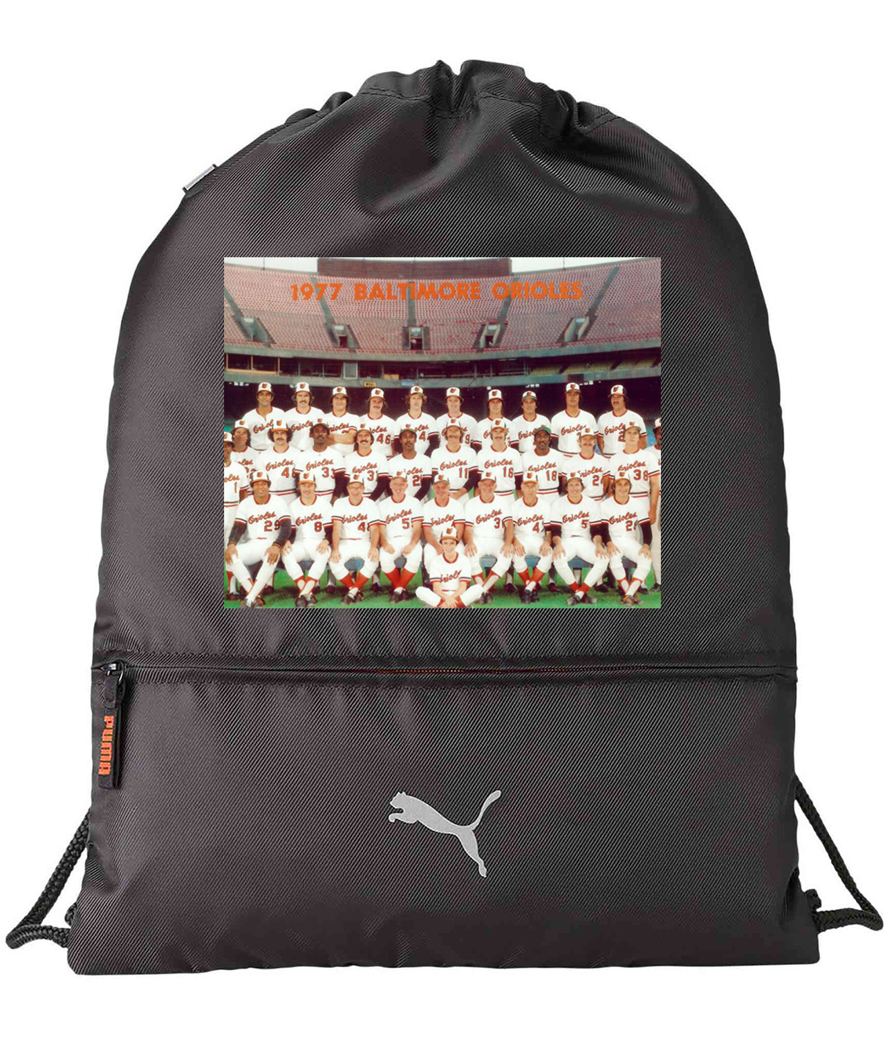 1977 Season Baltimore Orioles Photo Baseball Logo Symbol Emblem Customized Design on Lightweight Drawstring Backpack Bag