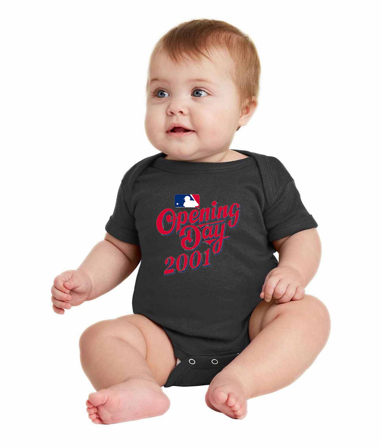 2001 MLB Opening Day Baseball Logo Symbol Emblem Customized Design on Infant Baby Rib Bodysuit