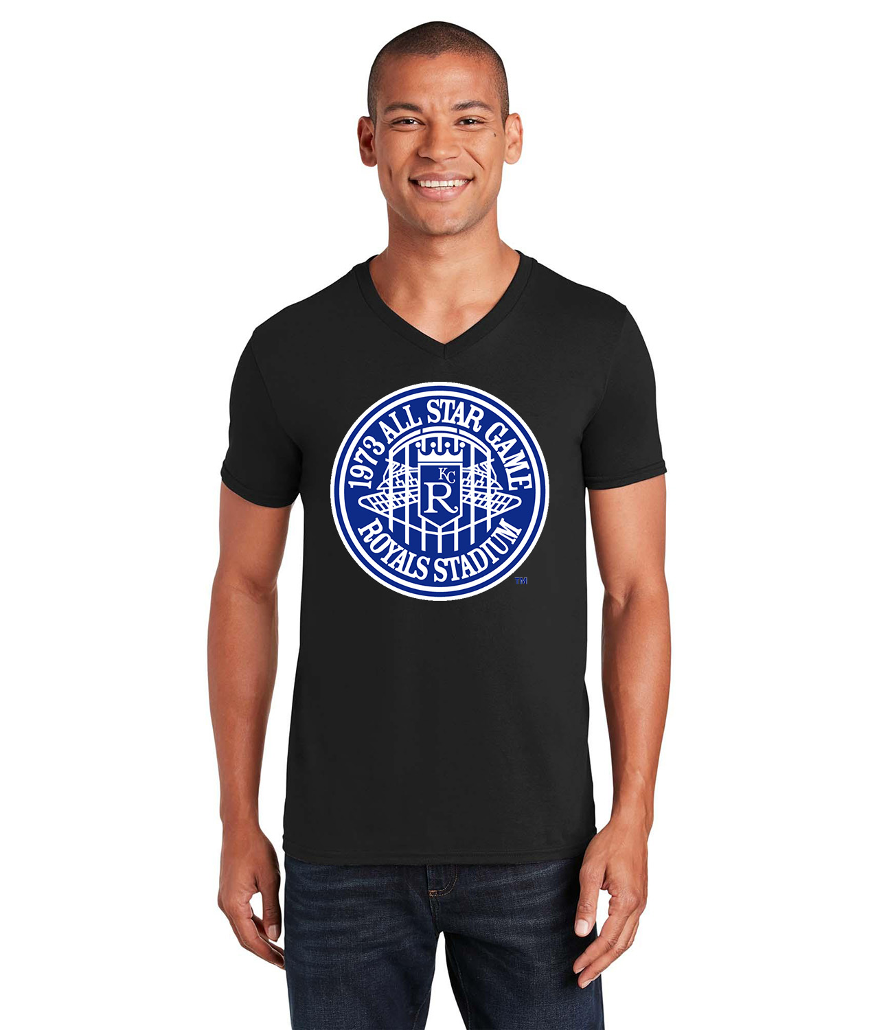 1973 MLB All-Star Game At Royals Stadium Kansas City Missouri Baseball Logo Symbol Emblem Customized Design on Unisex V-Neck T-Shirt Tee