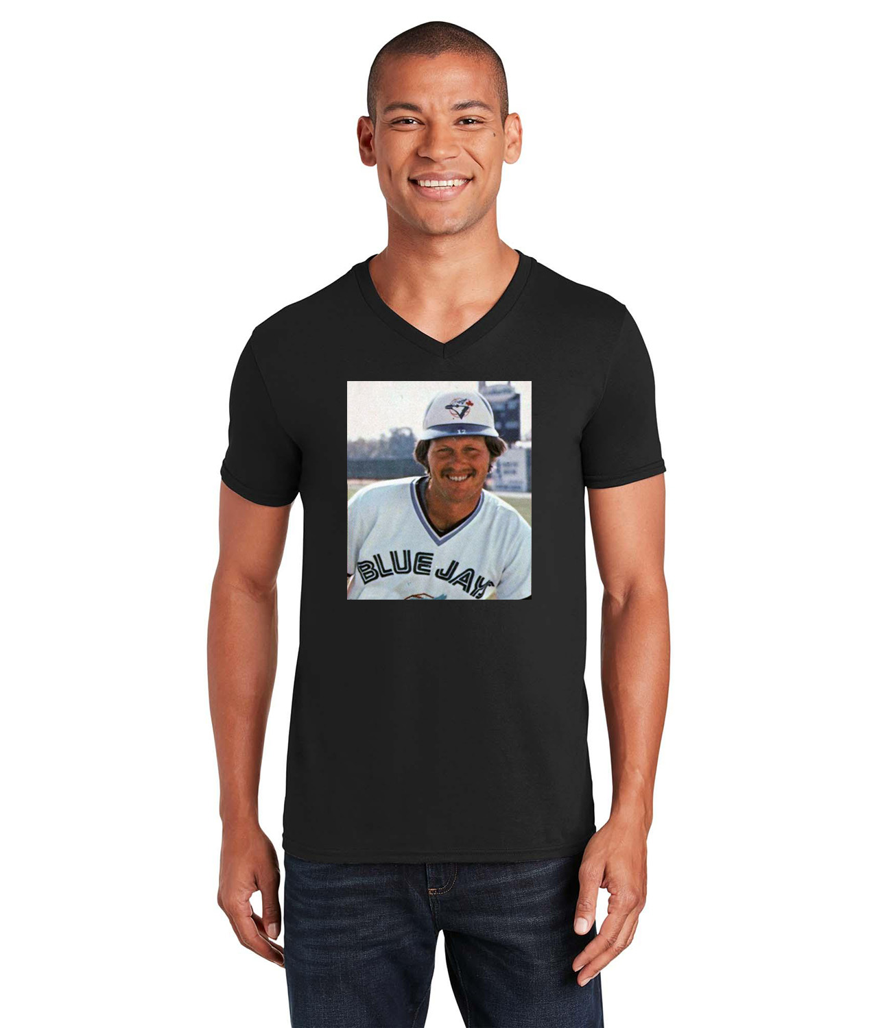1980 Ernie Whitt Toronto Blue Jays Photo Baseball Logo Symbol Emblem Customized Design on Unisex V-Neck T-Shirt Tee