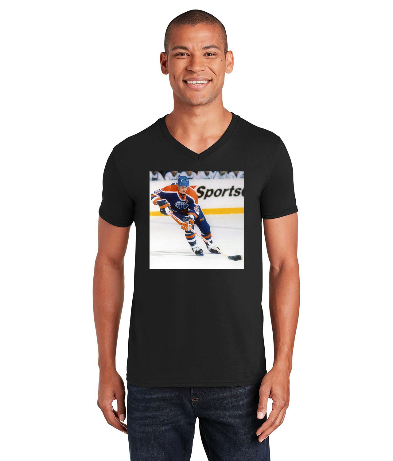 1980s Edmonton Oilers Photo Hockey Logo Symbol Emblem Customized Design on Unisex V-Neck T-Shirt Tee