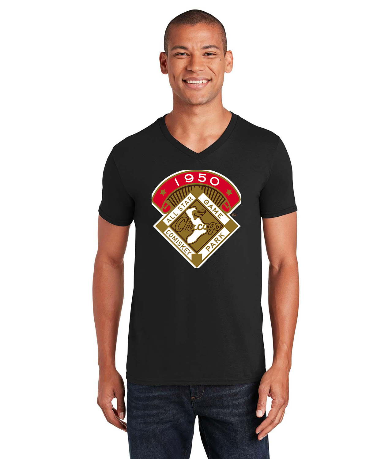 1950 MLB All-Star Game Comiskey Park Chicago Illinois Baseball Logo Symbol Emblem Customized Design on Unisex V-Neck T-Shirt Tee