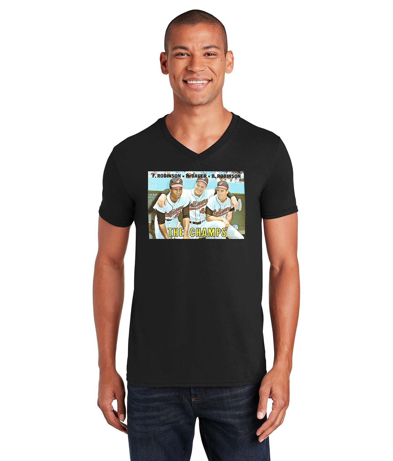 1967 the Champs F. Robinson, H. Bauer, B. Robinson Baltimore Orioles Photo Baseball Logo Emblem Customized Design on Unisex V-Neck T-Shirt Tee
