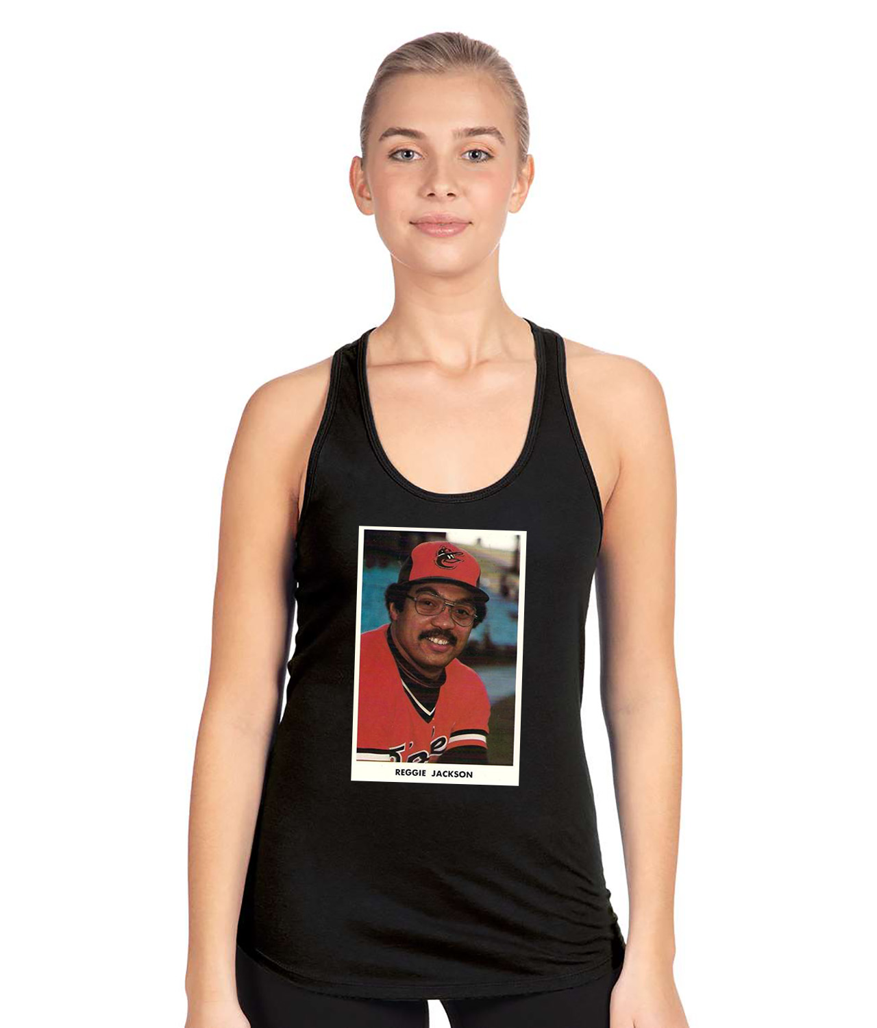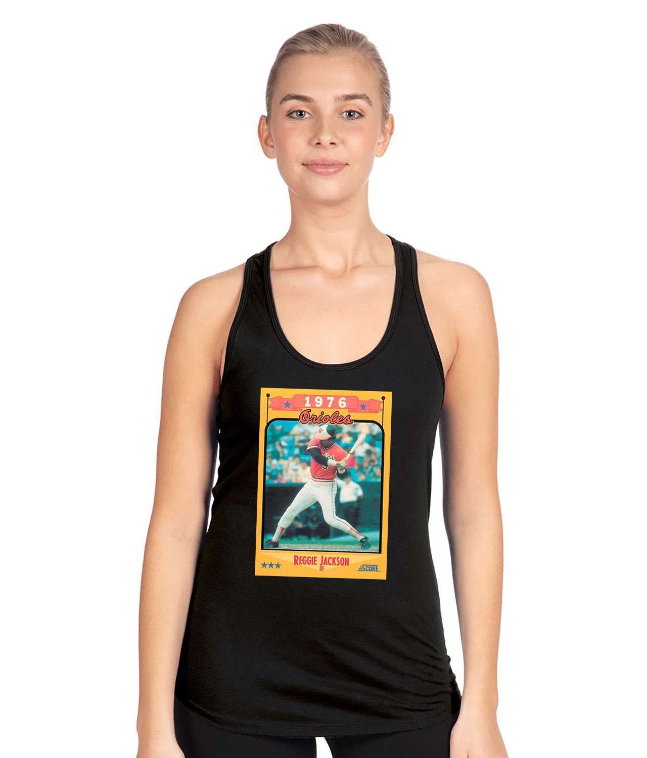 1976 Baltimore Orioles Reggie Jackson Photo Baseball Logo Symbol Emblem Customized Design on Women’s Racerback Tank Top