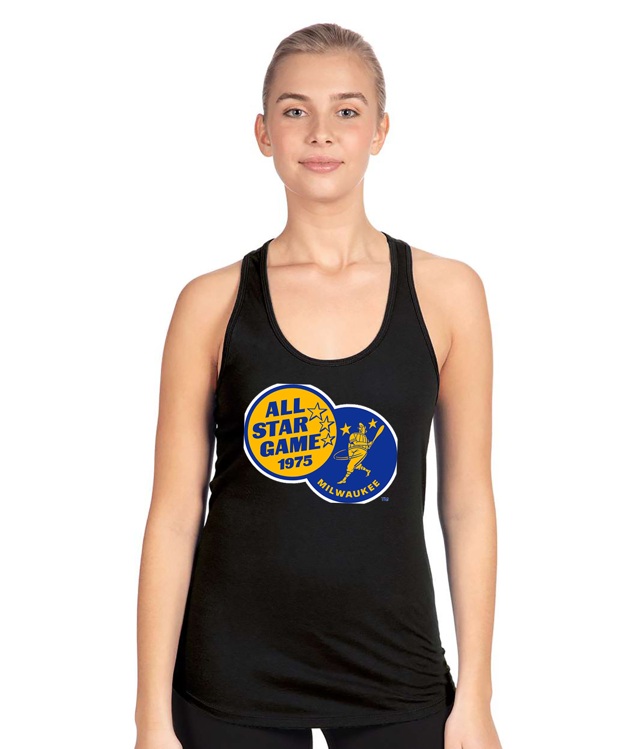 1975 MLB All-Star Game County Stadium Milwaukee WI Baseball Logo Symbol Emblem Customized Design on Women’s Racerback Tank Top