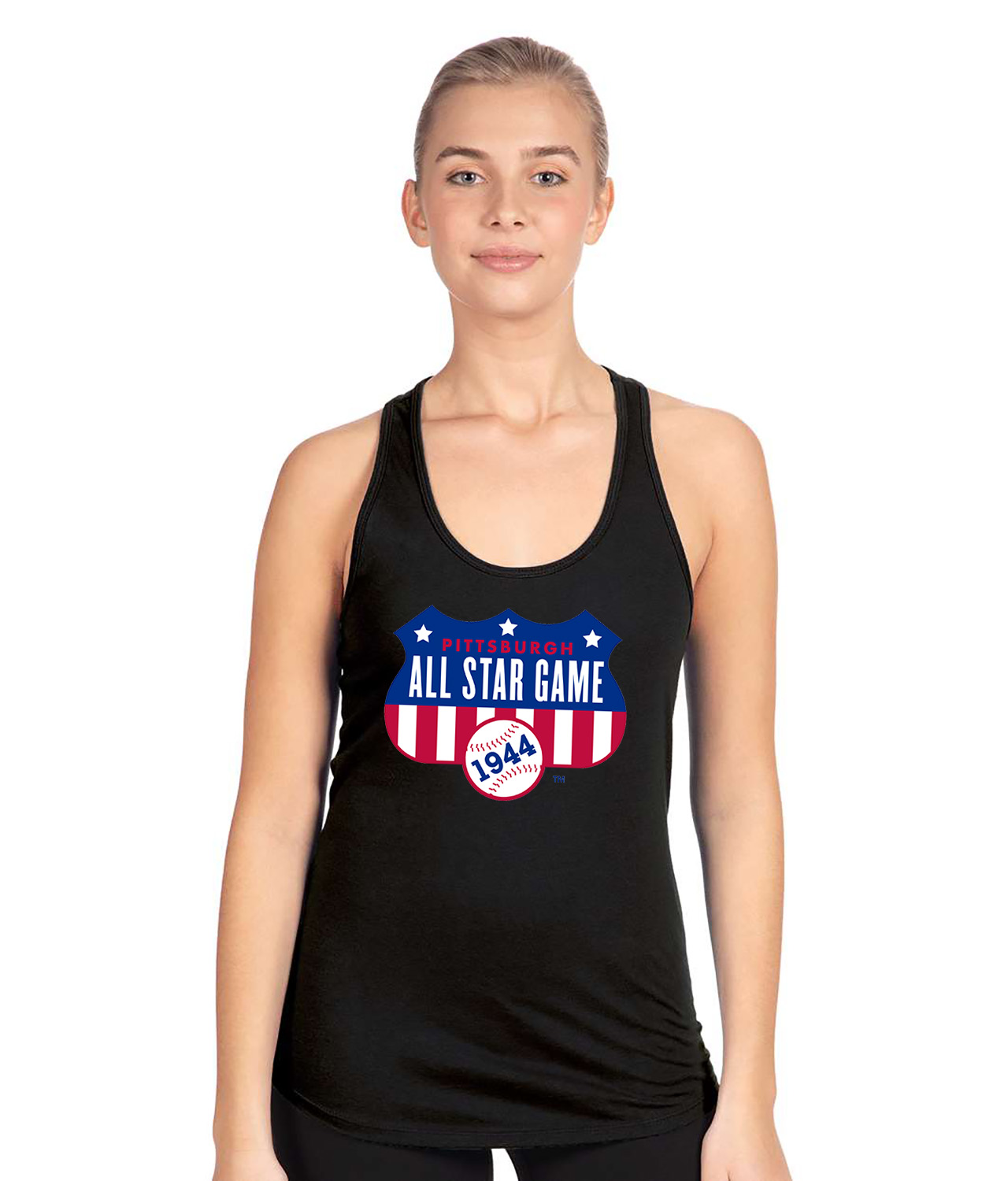 1944 MLB All-Star Game Forbes Field Pittsburgh Pennsylvania Baseball Logo Symbol Emblem Customized Design on Women’s Racerback Tank Top