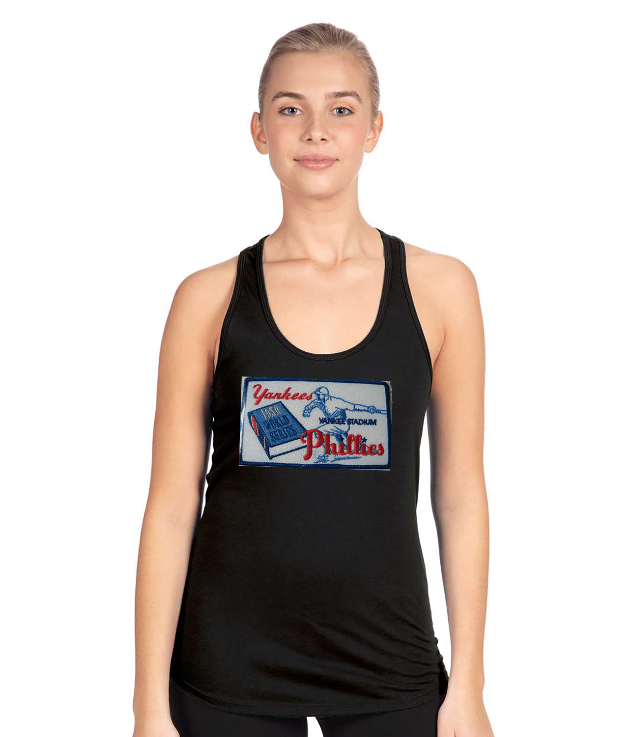 1950 MLB World Series Patch New York Yankees vs Philadelphia Phillies Baseball Logo Symbol Emblem Customized Design on Women’s Racerback Tank Top