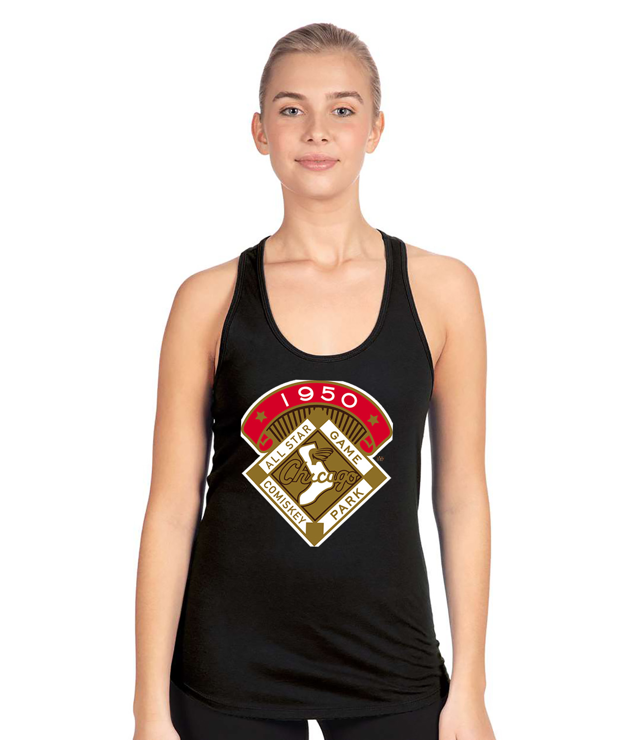 1950 MLB All-Star Game Comiskey Park Chicago Illinois Baseball Logo Symbol Emblem Customized Design on Women’s Racerback Tank Top
