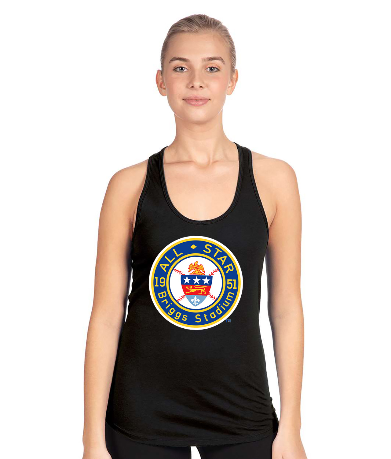 1951 MLB All-Star Game Briggs Stadium Detroit Michigan Baseball Logo Symbol Emblem Customized Design on Women’s Racerback Tank Top