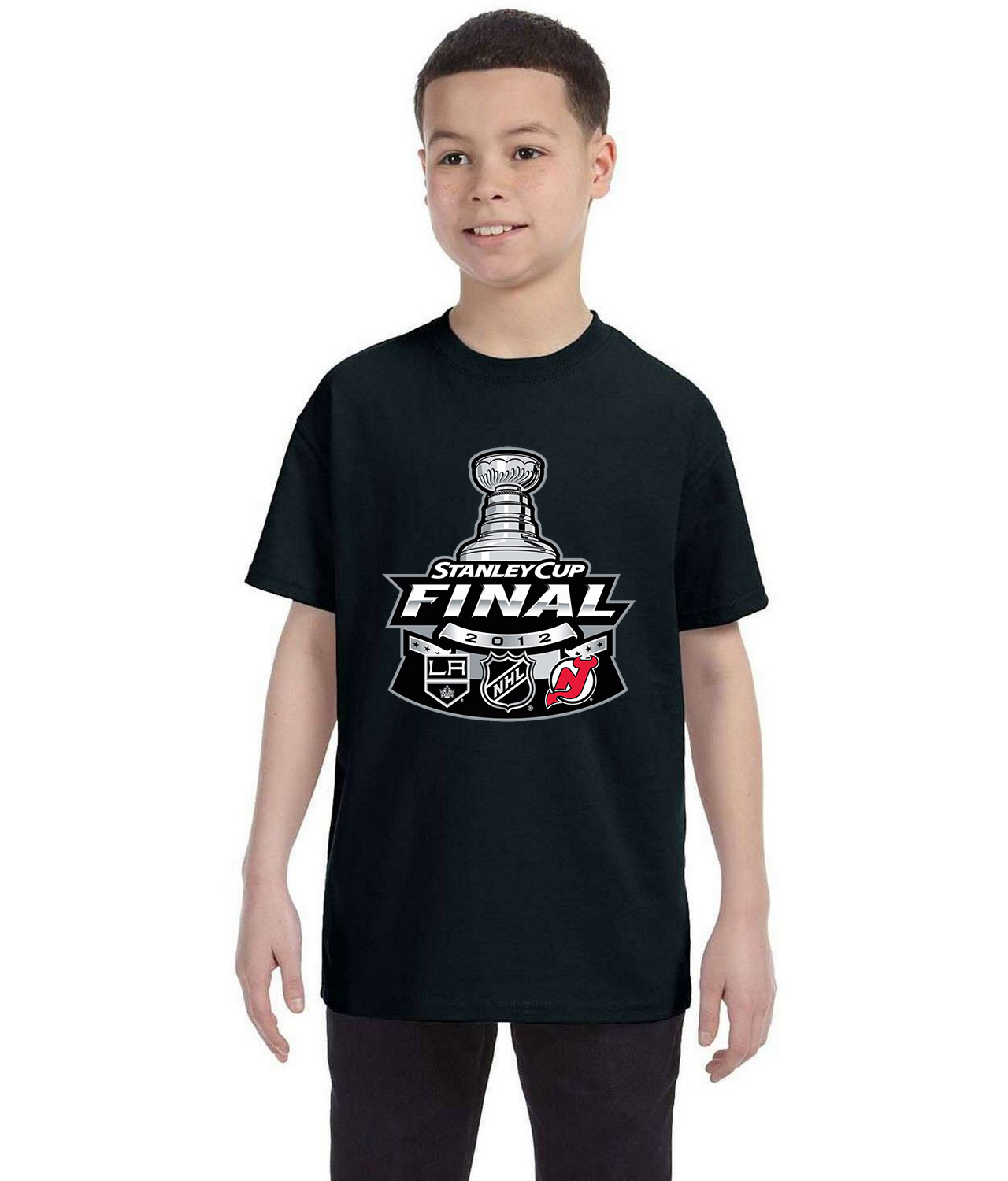 2012 NHL Stanley Cup Final Matchup – Los Angeles Kings Vs New Jersey Devils Hockey Logo Symbol Emblem Customized Design on Youth T-Shirt Tee